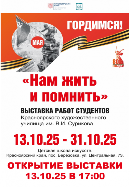 Передвижная методическая выставка работ студентов Красноярского художественного училища имени В.И. Сурикова «Нам жить и помнить» приурочена к Дню Победы в Великой Отечественной войне 1941 – 1945 годов. Она представляет тематические натюрморты и композиционные эскизы, выражающие отношение молодых художников к событиям военных лет. Методическая выставка знакомит с понятиями форэскиза, ритма, перспективы, масштаба, показывает роль силуэта в массовых сценах. Работы студентов показывают выразительность языка тона и варианты выделения композиционного центра. Работой студентов руководили такие педагоги, как Ежов В.И., Тимохов С.В., Асадчиков В.А., Ломакин А.Г., Дидковская В.К., Межова А.Н., Прохоренко Д.А.