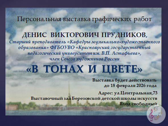 Приглашаем посетить выставку графических работ "В тонах и цвете" Дениса Викторовича Прудникова Выставка будет действовать до 18 февраля 2026 года в выставочном зале Березовской детской школы искусств